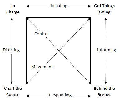 In-Charge & Behind-the- Scenes; "Control": Gefocust op de controle over de uitkomst. Chart-the-Course & Get-Things-Going; "Movement": Gefocust op beweging richting doel. Chart-the-Course en In-Charge; "Directing": Structuur geven, Direct. In-Charge & Get-Things-Going; "Initiating": Externe wereld, Interactie. Behind-the-Scenes & Get-Things-Going; "Informing": Uitlokken, Input zoeken. Chart-the-Course & Behind-the-Scenes; "Responding": Interne wereld, Reflectie, Traag.